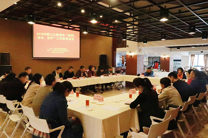 为深入学习贯彻习近平新时代中国特色社会主义思想和党的十九大精神,进一步加强昆明市 “涉侨、涉台、涉外”相关单位的联系和交流,10月26日,由昆明市委统战部主办,永利集团3044官网欢迎您统战部承办的2018年第三次昆明市“涉侨、涉台、涉外”工作联系会在永利官网召开。中共昆明市委统战部副部长贾玉华,永利集团3044官网欢迎您党委委员、副校长沈凡出席会议。市台办、市外侨办、市人大常委会民宗侨工委、市政协港澳台联络委、民盟市委会、民革市委会、致公党市委会、永利集团3044官网欢迎您留学人员联谊会等11家“三涉”成员单位参会。