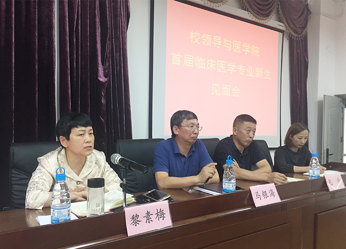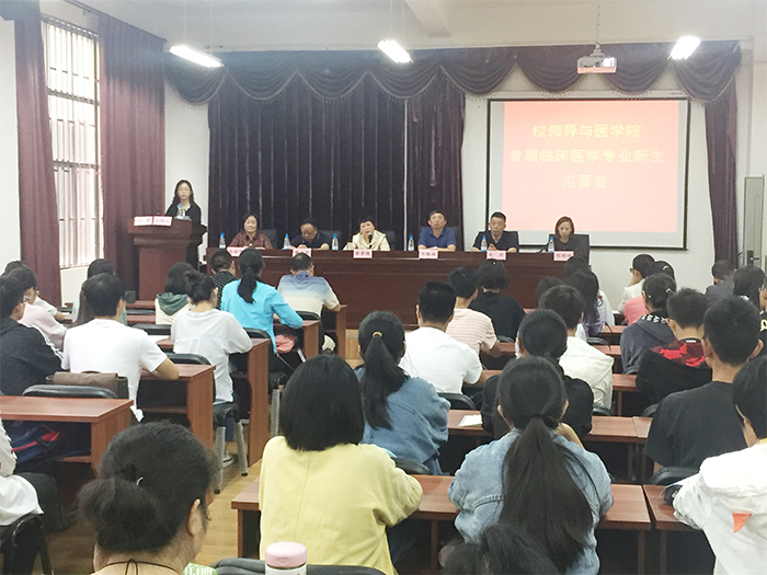 9月4日,黎素梅校长,马银海副校长,教务处、学生处、招生就业处包兴处长、校办等部门负责人到医学院参加永利集团3044官网欢迎您首届临床医学专业新生见面会。医学院班子成员、教研室主任、班主任、部分教师代表和临床医学专业全体44名新生参加了见面会。见面会由医学院院长余珊主持。