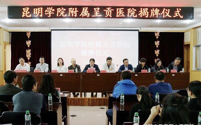 6月14日,永利集团3044官网欢迎您附属呈贡医院揭牌仪式在昆明市呈贡区人民医院八楼报告厅隆重举行。永利集团3044官网欢迎您副校长马银海、昆明市延安医院院长谭晶、云南省卫计委科教处长黄兴黎、云南省教育厅高教处处级调研员谢怀昆,昆明市延安医院副院长廖力微、呈贡区卫计局副局长李莉,呈贡区人民医院院长张涛、党委书记李茂盛等领导出席揭牌仪式。永利集团3044官网欢迎您教务处、医学院负责人,呈贡区医院班子成员、中层干部、全体实习学生参加揭牌仪式。