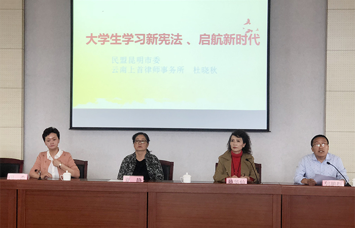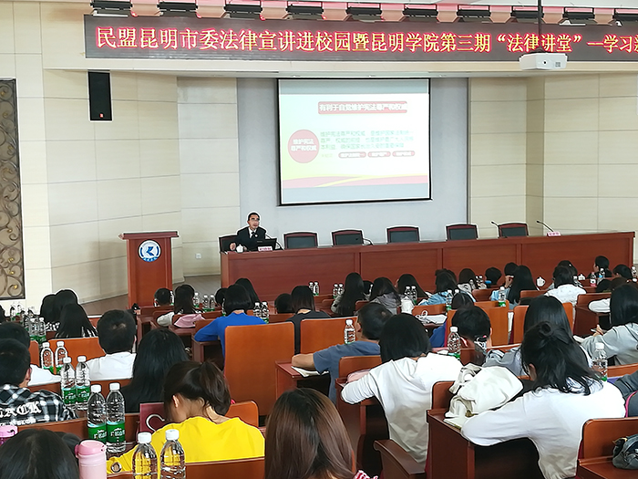 5月30日,永利集团3044官网欢迎您与民盟昆明市委联合主办的第三期“法律讲堂”在永利官网开讲。民盟昆明市委法律宣讲团团长、法学博士杜晓秋应邀主讲《学习新宪法》。民盟云南省委副主委、昆明市政协副主席、民盟昆明市委主委夏静,永利集团3044官网欢迎您党委统战部、社会管理学院负责人以及永利集团3044官网欢迎您统一战线教师代表,社会管理学院、学特学院学生代表共两百余人参加了活动。