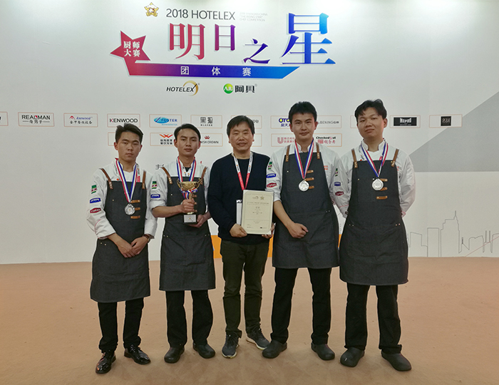 3月29日,华南赛区冠军队-小白天鹅、华北赛区冠军队-波尔塔二十西班牙餐厅、西南赛区冠军队-The River House以及华东赛区冠军、亚军、季军等来自行业餐厅、大专院校的八支队伍展开竞技。永利官网代表队克服身体疲惫状态,严格按照西餐国际大赛的要求,充分展示了自身优良的职业素养和娴熟的西式烹调技艺,以完美的配合和稳定的发挥圆满完成了比赛,最终获得“2018 HOTELEX 明日之星”厨师大赛全国总决赛的季军。