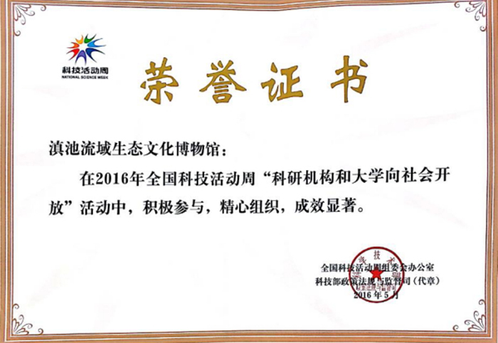 永利官网滇池流域生态文化博物馆在培训班还获得了全国科技活动周组委会办公室、科技部政策法规与监督司颁发的“科技活动周 荣誉证书”。