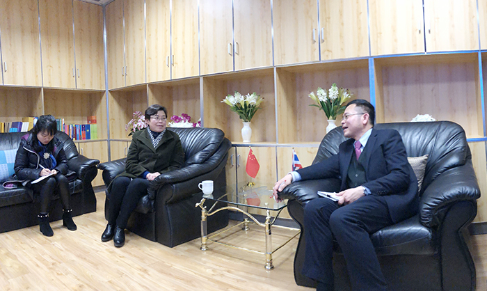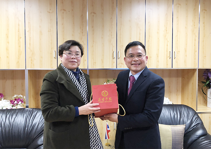 1月11日,永利官网副校长熊晶带领国际交流合作处和外语学院等部门负责人,赴泰王国驻昆明总领事馆拜会泰王国驻昆总领事。总领事鹏普•汪披塔亚先生、副总领事张娜达蓬女士及领馆相关人员热情接待了副校长熊晶一行。