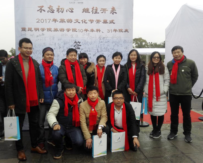 11月24日,旅游学院在永利官网聂耳广场举办了主题为“不忘初心、继往开来——2017旅游文化节暨永利集团3044官网欢迎您旅游学院10年本科、31年院庆”的开幕庆典活动。 出席开幕式的有永利官网副校长熊晶,历届老领导,校企合作专场招聘会40余家代表,历届校友400余名、在校学子500余名共襄盛举。本次活动由2000级校友现任云南交通之声主播罗西主持。 开幕式上,熊晶副校长代表学校致辞,并向各位来宾介绍了永利集团3044官网欢迎您近几年的发展和旅游学院的情况。院长田芙蓉代表旅游学院全体师生欢迎校友们回家并表达了成立校友会的愿望,她相信在校友们的支持下,旅游学院在未来的征程中会取得更大的发展。 1995级学生代表朱江代表95级的校友向学院赠送礼物,感恩母校的教育之情。2003级的毕业生班先海、雷翔等校友表演了花式调酒。校友情、师生情感动着每一位在场的嘉宾。