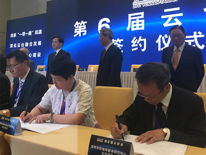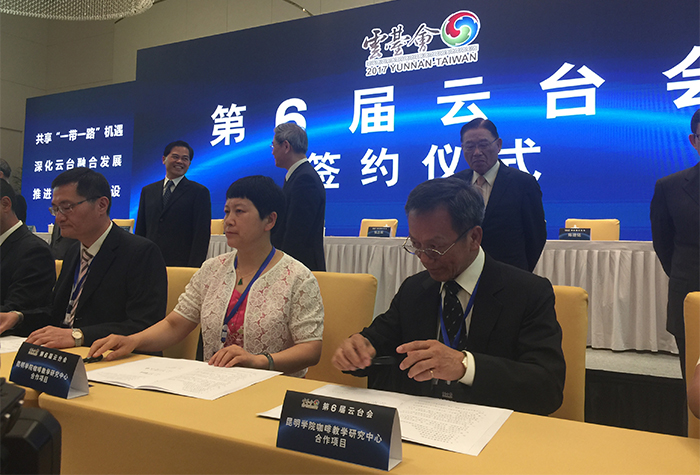 在中共中央台湾工作办公室、国务院台湾事务办公室主任张志军,海峡两岸关系协会会长陈德铭;中共云南省委书记、省人大常委会主任陈豪,省委副书记、省长阮成发;中国国民党副主席林政则,台湾三三企业交流会会长江丙坤各位领导的见证下,黎素梅校长代表永利集团3044官网欢迎您和台湾岚山咖啡公司董事长游启明先生签署了建立“咖啡教学研究中心”的协议。