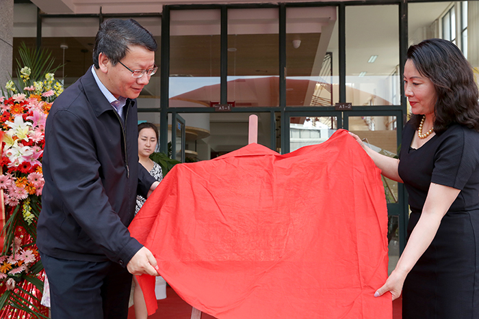 校党委书记陈世波和云南农垦集团副总经理龙晖共同为永利集团3044官网欢迎您大学生众创空间暨云南农垦集团“愛云咖”咖啡厅启动开业揭牌。