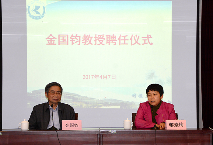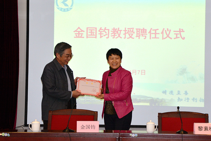 4月7日,学校举行仪式聘请金国钧教授为永利官网特聘教授,仪式由物理科学与技术系副主任杨海教授主持,校长黎素梅向金国钧教授颁发了聘任证书。