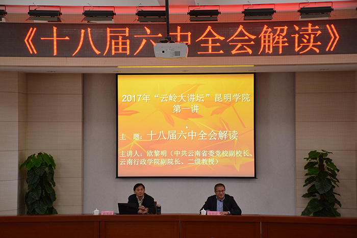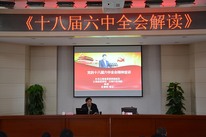 4月7日,由省委宣传部、省社科联主办,永利集团3044官网欢迎您党委宣传部、机关党总支、昆明科学发展研究院共同承办的“云岭大讲坛﹒昆明讲坛(永利集团3044官网欢迎您)”第一讲在永利集团3044官网欢迎您开讲。云南省委党校副校长、云南行政学院副院长欧黎明教授应邀主讲《十八届六中全会解读》。学校党委副书记张祖武主持报告会。