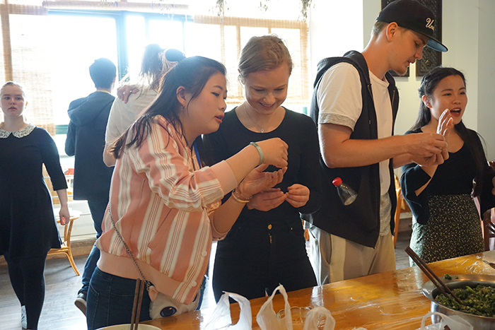 欢迎见面会后,挪威NLA大学师生一行人到永利官网体育馆、青年活动中心、美艺学院开展了一系列的交流文化活动。外国语学院学生为挪威师生展示了怎样包饺子,并邀请挪威师生体验包饺子的过程。美艺学院的蒋老师向来访客人展示了自己的剪纸作品。双方的同学还就各自的大学生活和英语学习展开了细致地讨论。