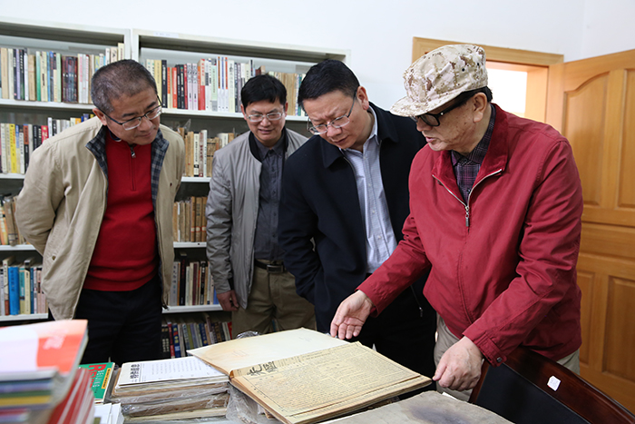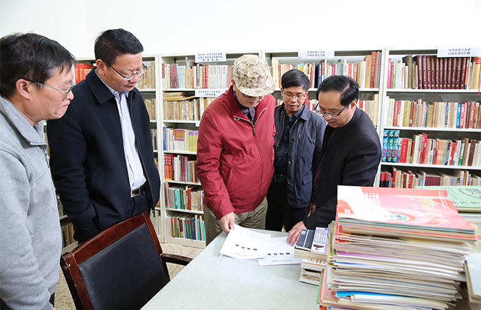 座谈交流后,陈世波书记、张祖武副书记陪同黄宏将军深入图书馆查看“马克思主义中国化足迹”专题展览资料整理情况。黄宏将军对2241册早期马克思主义中国化原著和1382册马克思主义中国化期刊如数家珍,一一查阅书目,对分类和整理提出指导意见。