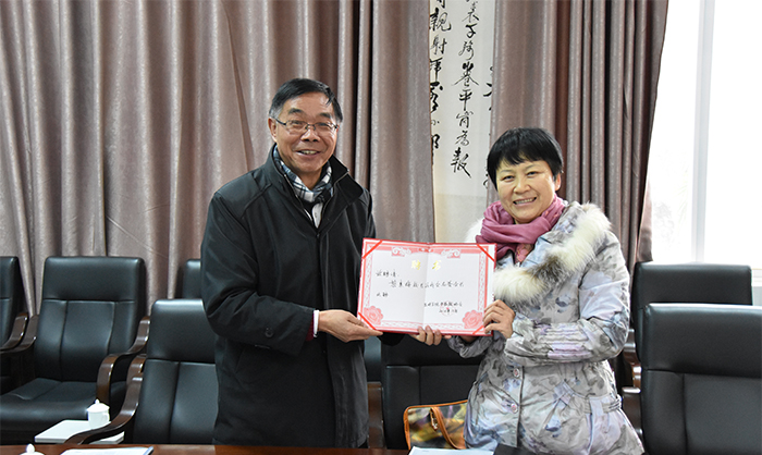 12月22日,在刚刚完成了新一届老教授协会换届工作后,永利集团3044官网欢迎您老教授协会特聘请校长黎素梅为名誉会长。新当选的会长张云权亲自将聘书送至黎校长手中。