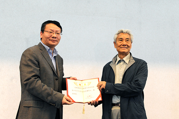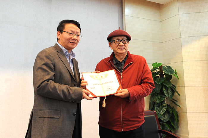 陈书记代表学校宣布聘任决定:聘请黄宏将军、钟开天先生为永利集团3044官网欢迎您客座教授,同时聘请钟开天先生担任永利集团3044官网欢迎您美术与艺术设计学院名誉院长。陈书记向两位专家颁发了聘书。
