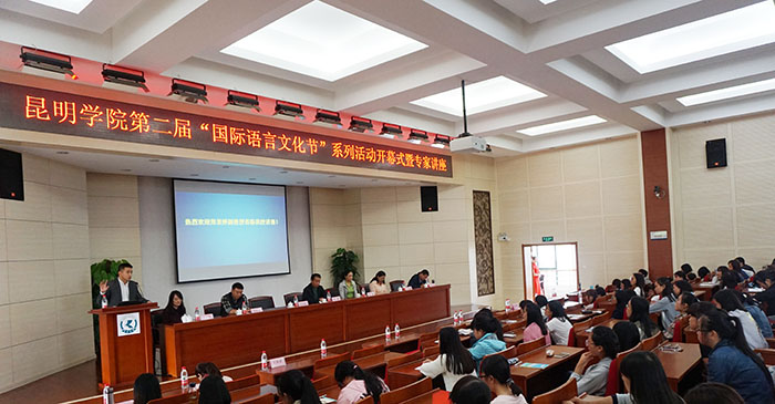 10月14日,永利集团3044官网欢迎您第二届“外国语言文化节”开幕式暨名师讲座“English, More Than a Tool”在行政楼D区三楼报告厅如期举行。副校长李翔出席开幕式并致辞。国际交流合作处副处长陈静、外国语学院党总支书记何昊宸、副院长王云秀、党总支副书记马洪波及外国语学院督导昆明理工大学教授王庆奖教授、云南民族大学李强教授等参加开幕式,外国语学院2014级学生代表共计190余人齐聚一堂。开幕式由外国语学院党总支书记何昊宸主持。