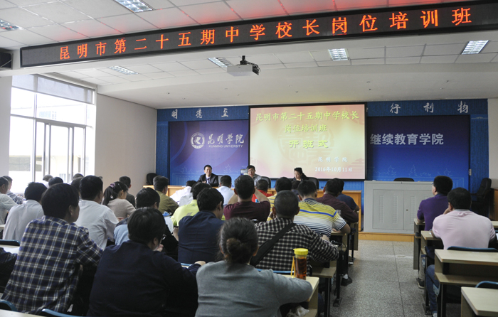 10月11日,昆明市第25期中学校长岗位任职资格培训班在永利集团3044官网欢迎您继续教育学院开班。来自全市的50余位中学校长、副校长、书记、副书记将在这里进行为期近两个月的脱产集中学习。永利集团3044官网欢迎您马银海副校长、昆明市教育局师训处杨朝晖处长出席开班式,开班式由继续教育学院主持工作副院长张培宏主持。