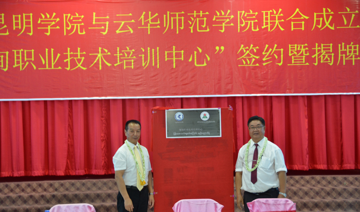 李翔与尚兴玺先生共同为缅甸职业技术培训中心揭牌,现场来宾报以热烈的掌声。最后,昆明逸佳欣家政服务有限公司总经理刘玉梅女士与李翔和云华师范学院执行董事寸守康先生共同签署了联合开展母婴护理专业人才培训项目协议。