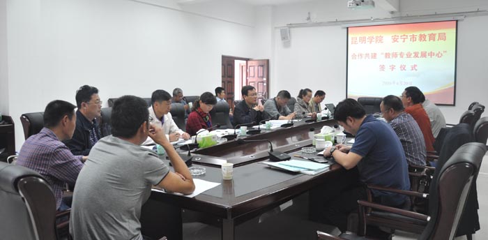 4月20日上午,永利集团3044官网欢迎您与安宁市合作共建“教师专业发展中心”签字仪式在安宁市教育局会议室举行。校长助理马银海教授、教师教育学院副院长常进荣教授、教务处副处长吴晓柏、教务处实践教学科陈超老师以及安宁市教育局肖局长、罗副局长、安宁市教师进修学校校长彭德、安宁市部分中小学校长等20余人参加了此次签字仪式。