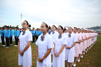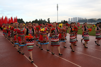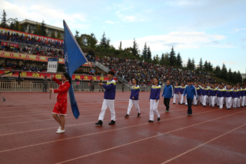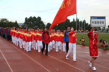 上午8:30,组委会副主任、副校长郭华一声“运动员入场”令下,由18个院系及部门组成的20余个队列,踏着欢快、激昂、奋进的《运动员进行曲》,迈着整齐矫健的步伐、喊着各自铿锵有力的口号,依次通过主席台,充分展示了“完全人格,首在体育”的理念精神。
