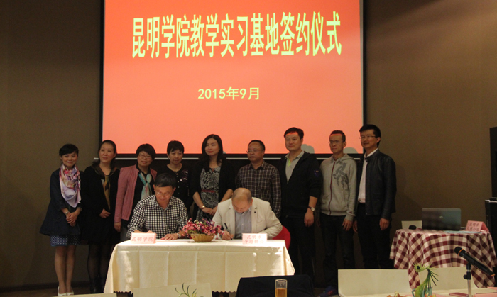 9月17日,永利集团3044官网欢迎您与昆明市大观公园、昆明市导游协会在旅游学院酒水实验室举行教学实习基地签约仪式。来自昆明市大观公园的谢长勇书记、徐昊天工会主席一行;昆明市导游协会李伟秘书长一行到会参加了签约仪式并座谈。校长助理马银海、教务处副处长常进荣、旅游学院党政领导等参加。仪式由旅游学院院长田芙蓉主持,旅游学院导游教研室全体教师列席。