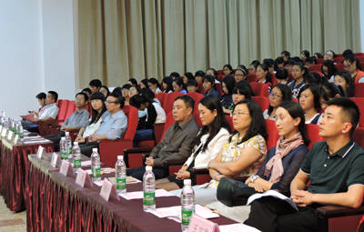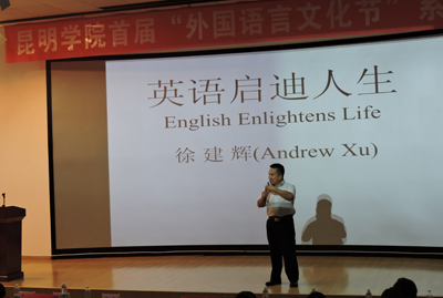 文化节简介之后,文化节的首项活动——名师讲座《英语开启你新的人生》精彩展开。讲座特邀著名英语节目主持人、英语教育专家、硕士研究生导师徐建辉教授主讲。徐教授一开场就通过自己学习英语、教授英语使自己的人生绽放华彩的经历激起了到场学生的热情与兴趣,进而分析了中国学生在学英语的过程中遇到的困难与问题,并在此基础上提出自己独到的解决途径—英语学习应从语言的声音入手及成功英语学习者应具备的五项素质。之后徐教授还现场示范带领学生练习英语发音,并与学生积极互动,解答学生关于英语学习的疑问。徐教授语言生动风趣、讲解深入浅出,整场讲座高潮频起、气氛热烈,激励鼓舞了永利官网学生全心投入英语学习的激情与斗志,为本届文化节拉开了成功的序幕。