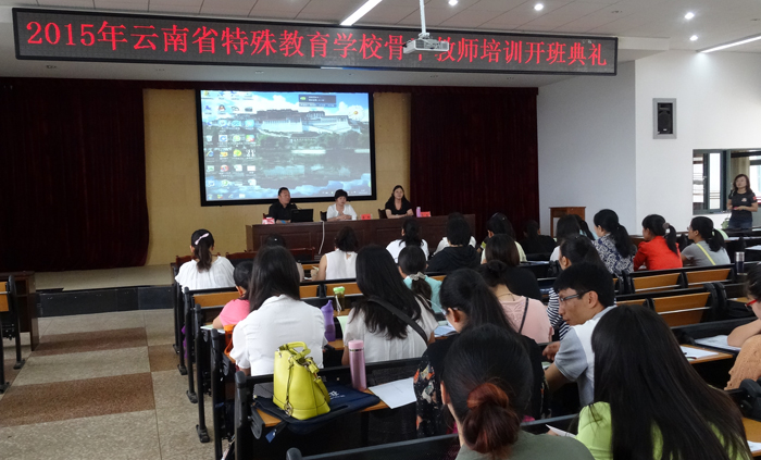 为进一步夯实我省特殊教育学校骨干教师专业知识技能,促进特殊教育事业发展,6月27日,2015年云南省特殊教育学校骨干教师培训开班典礼在永利官网惟行楼5301室举行,昆明市盲哑学校校长杨志成、教师教育学院院长唐敏、教师教育学院副院长李里以及全省120名特殊教育学校骨干教师参加了此次开班典礼,开班典礼由李里主持。