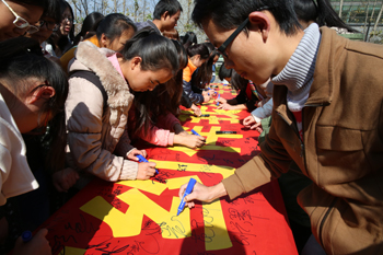 最后,参加启动仪式的全体师生在“勤俭节约伴我行”红色横幅上郑重地签上了自己的名字,立下了一份参与勤俭节约活动的承诺。
