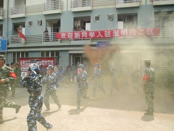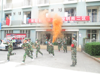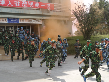 中午13:19分,校园上空响起消防警报,演练活动正式开始。澄明苑、润泽苑学生宿舍及食堂内突发火情,顿时,“起火”位置烟雾弥漫,“被困”学生在疏散引导员的指挥下用湿毛巾捂住口鼻低姿势快速撤离“起火”建筑物,并有秩序地向聂耳广场和体育馆广场疏散, 6分钟后,疏散人员安全到达指定地点,各军训营教官向总指挥报告疏散人数,所有人员被安全撤离。