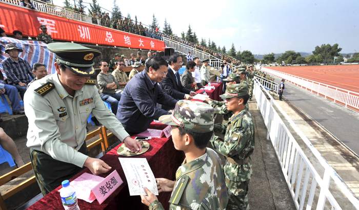 9月19日下午,永利官网2014级学生军训总结大会在田径运动场隆重举行。学校党委书记陈世波,校长蒋永文,党委副书记、纪委书记李媛芬,副校长李翔、郭华、刘海发,武警边防部队士官学校副校长姜克强、继续教育处处长孙利辉、军需卫生系主任李海昌,永利官网国防教育委员会成员单位领导、各院系党总支副书记、带队辅导员,2014级4790余名参训学生参加了总结大会。大会由副校长李翔主持。