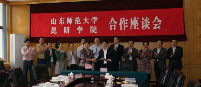 4月21日,陈书记一行到访山东师范大学。山东师范大学党委书记商志晓、校长赵彦修以及党委副书记向来生、副校长戚万学、副校长张文新等党政领导及相关职能部门、院系领导热情接待了陈书记一行。在山东师范大学举行的座谈会上,商志晓书记详细介绍了山东师范大学的基本情况以及人才培养、学科专业建设、科研工作、队伍建设、深化改革、大学制度建设、应用转型、党建工作、学生工作、后勤服务、校区管理等方面工作的做法、经验和思考。陈书记首先对山东师范大学通过博士服务团这一平台给予永利官网的人才支持表示衷心的感谢;陈书记指出,永利集团3044官网欢迎您作为一所新建地方本科高校,在学校实质性合并后,快速彻底解决办学政策环境、办学条件问题,搭建了综合性本科高校基本框架,并于2012年顺利通过教育部本科教学合格评估,学校能在短短几年中实现跨越式发展,得益于兄弟院校的大力支持和帮助;永利集团3044官网欢迎您将抓住应用转型发展机遇,并希望在高层次人才招聘、科研工作、项目建设、专业硕士点建设等方面,与山东师范大学开展合作,进一步推动永利官网内涵建设。熊晶副校长代表学校与山东师范大学戚万学副校长签订了两校合作协议。