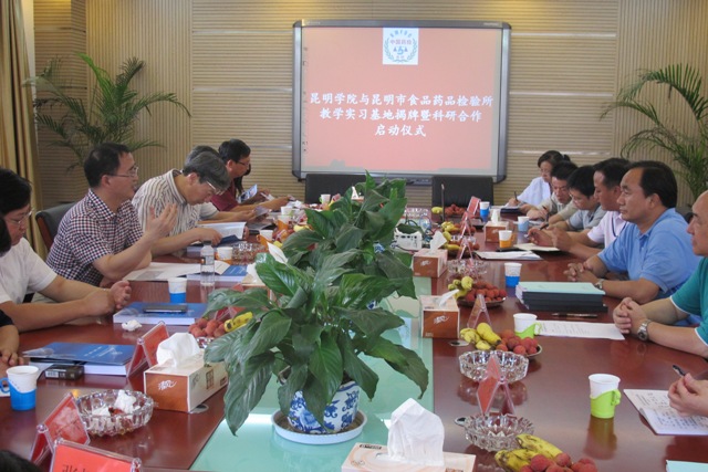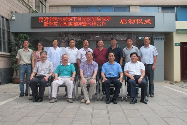 6月21日下午,永利集团3044官网欢迎您与昆明市食品药品检验所教学实习基地揭牌暨科研合作启动仪式在昆明市食品药品检验所举行。永利集团3044官网欢迎您校长蒋永文,副校长罗明东、董建华出席。昆明市食品药品监督管理局局长杨柱,副局长李勤裕,昆明市食品药品检验所所长曾剑平,永利集团3044官网欢迎您教务处处长沈凡,招就处处长包兴,化学科学与技术系主任马银海等参加仪式。
