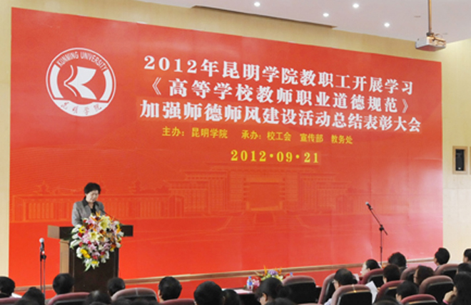 李副书记就永利官网2012年开展学习贯彻《高等学校教师职业道德规范》加强“师德师风”建设活动作总结讲话。她说,为了进一步贯彻《高等学校教师职业道德规范》,加强“师德师风”建设,倡导全校教职工立足本职岗位,兢兢业业工作,忠诚党的教育事业,争当教书育人模范。学校自5月开展学习《高等学校教师职业道德规范》加强“师德师风”建设活动以来,各单位认识到位、精心组织,学习形式多样,成效显著,涌现出了一大批先进集体、先进个人。有的教学院系将学习活动与“迎评促建”有机结合,把“规范”作为“师德”考核的基本要求,把教学、科研、日常管理等工作业绩作为全面评价师德的依据,把师德表现又作为教师绩效评价、聘任和评优奖励的首要标准,建立健全师德考核体系和档案;有的院系将“师德师风”列为年终履职考核的内容,将教师担任班主任、学生学习辅导等要求作为申报职称的必要条件,实行一票否决;加强教师学术诚信,严肃学术纪律,规范学术行为等践行《高等学校教师职业道德规范》具体措施;有的将学习活动与学生的管理服务工作相结合,组织动员教职工捐助因病、因突发事件导致生活困难学生,对贫困学生进行家访,建立党员助困基金,认真践行敬业爱生,真心关爱学生,严格要求学生,公正对待学生,做学生良师益友。