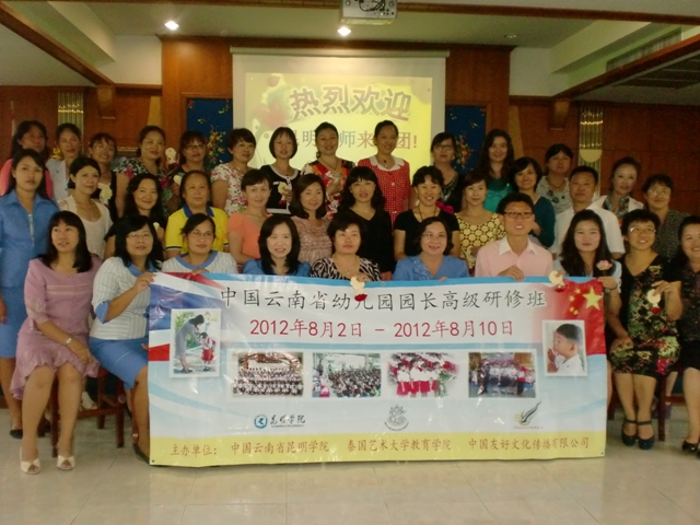 为发挥永利官网服务地方经济社会发展的作用,学习周边国家学前教育的办学理念和模式,提高幼儿园园长的管理水平,推进教育国际交流合作和我省学前教育的改革发展,8月2日至10日,永利官网国际交流合作处、教师教育学院和泰国Silpakorn大学(艺术大学)教育学院、中国友好文化传播有限公司(泰国)联合举办“中国云南省幼儿园园长高级研修班”。来自昆明市和8所地州幼儿园的32位园长在永利官网教师教育学院院长唐敏带领下考察了泰国Silpakorn大学(艺术大学)教育学院、泰国艺术大学附属幼儿园、约瑟小学及幼儿园、巴西龙成学校等教育机构。泰国艺术大学教育学院副院长为考察团举办了关于学前教育的发展及管理专题学术讲座。