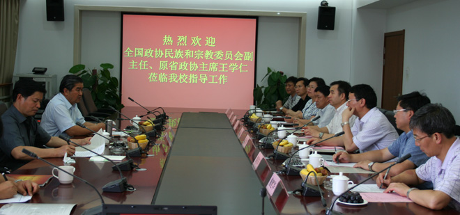 王学仁副主任在听取汇报后作了重要讲话。他首先肯定了学校的校园建设、学科建设等工作。他说,我今天是来参观学习的,看后深受鼓舞,学校在短短的几年里,整体发展上台阶、富有成效;配齐了班子、完善了机制、健全了学科;尤其是新校园的选址具有战略性和前瞻性,做到科学规划、快速建设;在专业设置和科研工作上能很好地结合地区经济社会的发展需要,做全学科、有提升,突出办学特色、成效显著。