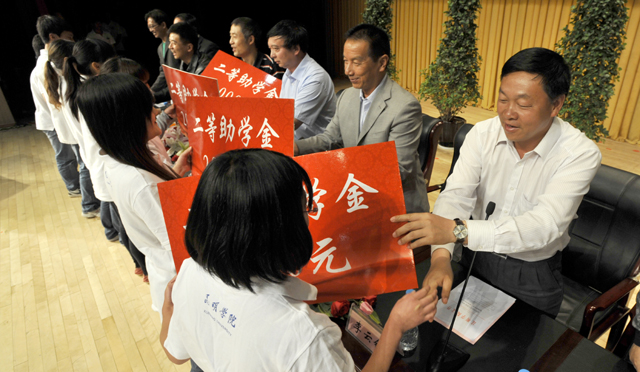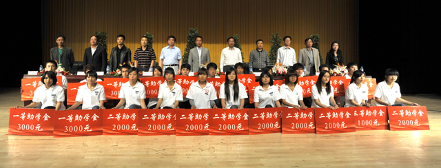 学生处处长刘宜萍宣读了49位家境贫寒、品学兼优的受资助学生名单,受助学生乍洪英代表受助同学发言,与会领导为获助同学颁发获奖证书,并与受助同学合影留念。
