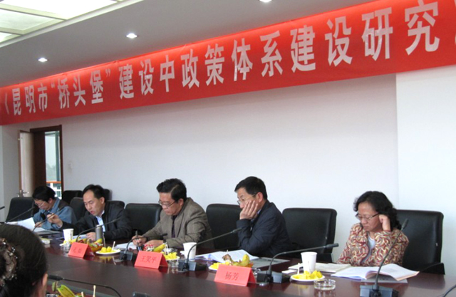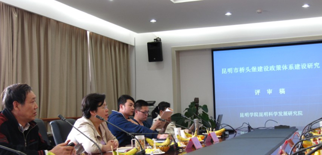 4月11日下午,由昆明市发改委委托永利集团3044官网欢迎您研究课题《昆明市“桥头堡”建设中政策体系建设研究》专家评审会在永利官网举行。省政府研究室副主任孔灿,市委政研室主任袁培文,市政府研究室主任王笑平,市社科联主席杨芳,市政府副秘书长、昆明市金融办主任洪维智,昆明市发改委黄建玮处长,以及学校科研处负责人和课题组全体成员,参加了评审会。评审会由科发院黄继元教授主持。
