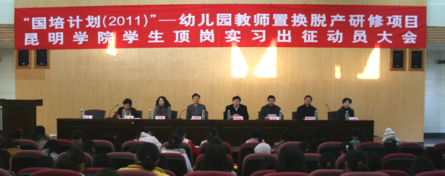 会上,职业技术教育中心主任熊绍宏老师着重介绍了“国培计划”实施的背景、任务、意义以及云南省近两年来实施国培计划的情况。教师教育学院主持工作的副院长唐敏教授则从专业知识和技能方面要求全体同学们做好各种准备。罗明东副校长在会上作了重要讲话,他要求每一位同学要牢记“国培计划”的使命,充分认识此项工作的重大意义,明确职责和任务,从思想、心理、专业知识和技能等方面做好充分准备。他希望同学们要利用参与此次“国培计划”的机会,深入基层、了解社会、拓宽视野、增长知识和才干。同学们要克服种种困难,在为当地学前教育事业科学发展做出贡献的基础上,展示永利官网大学生的风采,自觉维护学校的良好形象和声誉。2009级学前教育2班包敏同学代表全体同学发言,表达了完成此次顶岗置换实习任务的态度和决心。最后,刘海发副校长作了总结讲话,他要求职业技术教育中心、教师教育学院要协调好各方面的关系,学校也会创造一切条件为同学们解决后顾之忧,希望同学们安心并用心对待此项工作,不负国家的重托和学校的期望,圆满完成此次顶岗置换实习任务。刘副校长还就顶岗实习期间的安全问题作了具体要求,希望同学们要增强个人安全防范意识,杜绝任何安全事故的发生,职教中心和教师教育学院要主动全面跟踪每个实习点学生的情况,要为学生开设24小时开机的热线电话,为学生提供全天候服务。