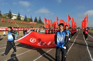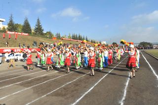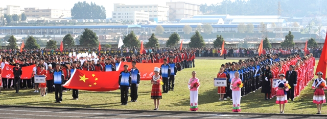 上午9时,1万余名师生沐浴在金秋的阳光下,19支师生代表队踏着欢快、激昂的运动员进行曲,迈着矫健的步伐入场后,全体起立,奏唱中华人民共和国国歌。