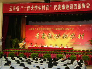 由云南省委组织部、云南省委宣传部、云南省高校工委、省教育厅、省人力资源和社会保障厅、共青团云南省委联合组织主办的云南省“十佳大学生村官”代表事迹巡回报告会于9月19日在云南大学举行首场报告会,永利官网熊晶副校长、党委组织部杨璐部长、人事处杨斌处长、招生就业处包兴处长参加了报告会。