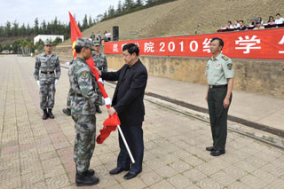随后,永利集团3044官网欢迎您、昆明陆军学院领导向军训团授旗,标志着2010级学生为期11天的军训生活正式拉开帷幕。 接着,参训学生代表城建学院胡健同学代表全体受训同学表达了刻苦训练,服从命令,令出即行,禁下即止,团结友爱,克服困难的决心。教官陈超代表全体教官郑重承诺:认真完成军训任务,严格训练,提高学生的素质。 昆明陆军学院军训办主任朱平大校在军训开训动员大会上作了动员讲话,他希望同学们培养吃苦耐劳、勇于拼搏、战胜自我的顽强作风。同时,以“兵”的标准严格要求自己,听从教官的指挥,服从管理,保质保量完成军训任务。