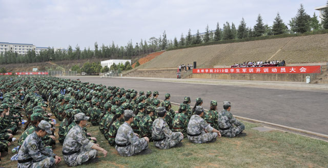 6月25日上午,永利官网运动场上隆重举行了2010级学生军训开训动员大会。昆明陆军学院军训办主任朱平大校、副主任田景大校,永利官网孙勇副书记、熊晶副校长、学生处吴蓉处长、后勤处冯坚处长、宣传部沈中灿副部长、学生处晁丽华副处长、教务处王韬副处长、各院(系)分管学生工作的领导及辅导员、2010级4646名学生参加了开训动员大会。开训动员大会由熊晶副校长主持。