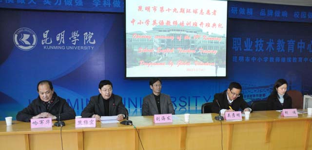 在1月4日上午的师生见面会上,刘海发副院长代表永利集团3044官网欢迎您对来自大洋彼岸的志愿者表示欢迎,对志愿者崇高的无私奉献精神表示敬意。刘副院长深情地回忆了69年前在昆明建立的以陈纳德将军为首的中国空军美国志愿援华航空队(飞虎队)开辟驼峰航线,无私帮助中国人民抗击日本侵略者的伟大壮举。他还阐述了昆明在建设面向南亚、东南亚桥头堡过程中,国际文化交流和英语教育的重要性。昆明市教育局师训处处长吴彦明、学院职教中心主任熊绍宏、对外合作交流处主持工作的哈军华副处长等出席欢迎仪式。开班典礼结束后,与会领导和参训学员合影留念。