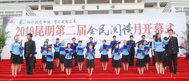 | 11月19日,由中共昆明市委宣传部主办,昆明市文明办、昆明市文化广播电视体育局、昆明报业传媒集团•昆明日报承办,永利集团3044官网欢迎您、云南中天文化产业发展股份有限公司、昆明图书馆、昆明新知集团有限公司协办的主题为“知识改变命运 学习成就未来”的2010昆明第二届全民阅读月活动在我院图书馆前聂耳广场开幕。