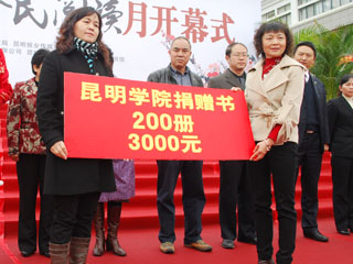 开幕式上,市政府副主席、市文联主席汪叶菊宣布 “2010昆明第二届全民阅读月”活动开幕!我院文学与新闻传播系学生代表宣读了永利集团3044官网欢迎您师生向全体市民发出的阅读、学习的倡议。同时,我院图书馆馆长何琍芳、副馆长曹卫华代表永利集团3044官网欢迎您向贫困地区儿童捐赠内容涉及教育、科普、世界名著、文学、经济等知识的图书200余册。