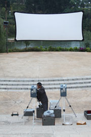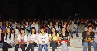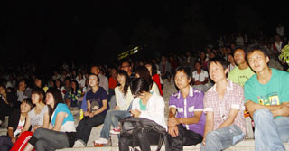 露天电影每晚8点整在心湖广场准时播放,随着影片的持续播放和宣传力度的进一步扩大,观影同学的人数与日俱增,从第一场电影200余人观影到后几场放映时观众已超过1000余人。迄今为止,播放了《十月围城》、《叶问2》、《村官普发兴》、《谍报风云》等五部电影。