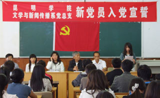 6月24日下午,文学与新闻传播系党总支在昆师路校区隆重举行新党员入党宣誓仪式。文新系党总支书记桂彦南、副书记姜晓霞等老师参加仪式,学生第二党支部书记贾斌老师主持。 仪式在庄严的《国际歌》中拉开帷幕。全系2010年新发展的85名预备党员,在冯佳老师的领誓和姜晓霞老师的监誓下,面向鲜艳的党旗进行了庄严宣誓。之后,徐舒同学代表新党员进行了发言,向党组织表达了当代大学生时刻跟党走,把青春献给党的决心。最后,党总支书记、系主任桂彦南老师以一名老党员身份与参会党员交流和分享了自己的感受,勉励新党员“要把自己当做一滴水,自觉融入到党的事业的大海中”,积极投身于党领导下的民族振兴伟大事业,并在其中努力实现自己的人生价值;同时,桂书记要求广大党员同志要以党性来引导心性,使自己成为对民族、对国家和社会有“大忠、大义”,对亲人、朋友有“大仁、大爱”的新时代的党员。 这是文新系党总支成立以来的首次举行的新党员宣誓仪式,增强了文新系广大师生党员入党的神圣感和使命感,使全体师生党员对入党有了更为深刻的理解和认识,进一步坚定了为共产主义奋斗终身的信念,为文新系加强党的基层组织建设奠定了坚实的基础。 政法系党员牢记誓言争先创优