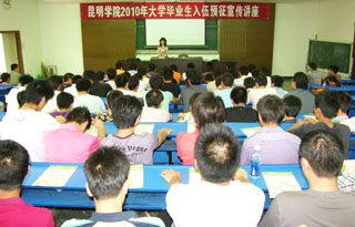为使每个毕业生都能知晓国家鼓励高校毕业生应征入伍的政策,增强毕业生履行义务参军报国的积极性和主动性,切实把预征工作的各项工作落到实处, 5月13日下午,我院特邀云南省征兵办公室赵参谋到昆师路校区进行“永利集团3044官网欢迎您2010年大学毕业生入伍预征宣传讲座”,各系约200名应届毕业生代表到场听取讲座。