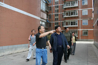 | 为全面落实学院党委2010年4月9日会议精神,根据学院整治建筑物立面挤占公共空间工作领导小组4月13日紧急会议安排,4月15日下午张寿国副院长率领学院整治工作领导小组有关成员和相关部门工作人员分别到昆师路校区、潘家湾14号院、人民西路校区本部及西二院等教职工住宅地进行实地调研。