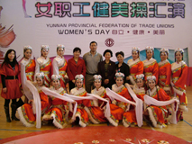 3月2日在昆明医学院学生会堂,我院师生组成的健美操队,代表昆明市总工会参加“云南省总工会庆祝‘三八’国际劳动妇女节100周年暨女职工健美操汇演”。院女工委主任周明教授亲自创作并带队参演。我院融健美、民族、欢快为特点的《“三八”欢歌》健美操博得了省市妇联领导的好评和汇演现场观众的阵阵掌声。