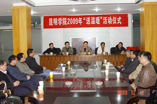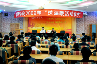 为了帮助家庭经济困难学生温暖过冬,把学院的关爱送到贫困学生心中,经过精心筹备,12月2日(星期三)下午17:30,学院在五个校区同步举行2009年“送温暖”活动仪式,对家庭经济困难学生发放御寒物品。