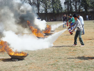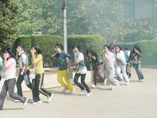 演练活动分为应急疏散和灭火实战两个部分。13:00整,男、女生宿舍突发“火情”,顿时宿舍楼周围浓烟弥漫,警报鸣响,广播里传出“火情”播报,我院立即启动演练暨紧急避险指令。之后安全保卫组、紧急救援组、医疗救护组立即赶赴火灾现场,消防车呼啸疾驰冲向火场,强大的水柱喷涌而出将火势控制。男、女生宿舍楼的全体师生紧急有序的向操场安全区域撤离,一名假定伤员在现场进行紧急救治后,被抬上车辆送往医院。5分钟内,17个班级900余名师生全部安全撤离到操场并整队就绪。在灭火实战演练中,同学们分别运用灭火器、消防水带、棉被等灭火工具将不同类型的初起火灾扑灭。同学们娴熟地进行液体、固体燃烧物的灭火,窒息性灭火操作,较好地完成灭火任务,赢得了观摩师生的阵阵掌声和欢呼声。