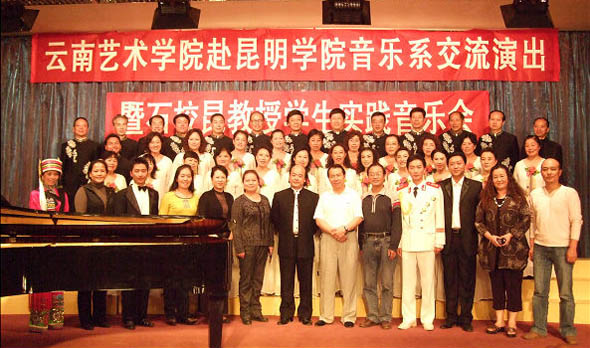10月27日晚,云南艺术学院继续教育学院副院长石校昆教授带领部分学生到音乐系交流演出。音乐系系主任靳丽芬、党总支副书记王耀勇、主任助理黄清林及龙泉路校区的部分师生近五百人观看了演出。